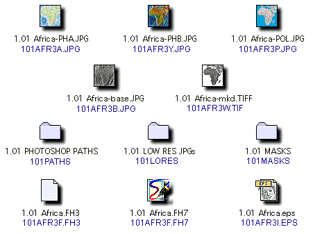 4. Low-resolution (72ppi) versions of all of the relief maps and masks, in JPEG format. These are identified by "L.JPG" as in "1.01 Africa-base L.JPG"