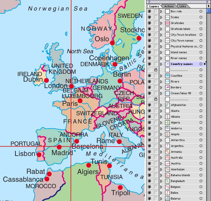 Example of the Mountain High Maps World Illustrator Map #604 Note the Layers palette showing the layers "switched on" or "switched off" In order to customize this map, the layers may be switched on or off or modified To modify one layer, lock all other layers, then select all, then modify the objects All countries are individually layered and can be modified for fill color All map layers are editable in terms of line thickness, color, font sizes etc.... For more details see the Illustrator MHM User Guide World map above is a screen shot of the Illustrator EPS map with default out of the box settings. Any and all layers can be modified at will to come up with your custom look. |