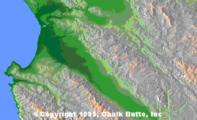 View a two full size sample US Digital Topography map. Each map tile (or quadrangle) is one degree of latitude by one degree of longitude. Each quadrangle is designated by the latitude and longitude of the South-East corner - this sample is located at 36° North / 121° West and features the coastline and an area inland from Monterey and Salinas, California. Your browser will transfer this image in a few minutes, however, to manipulate the image you may also use Adobe Photoshop or a similar image editor that can open or import JPEG format images. The file is sized at 1.1 Mbyte and will decompress to approx 2 Mbytes: