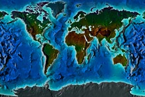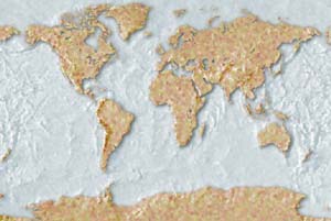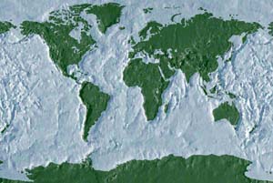 Pale green & brown land - mottled blue ocean