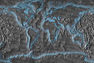 Dark grey land edged in blue - dark gray ocean