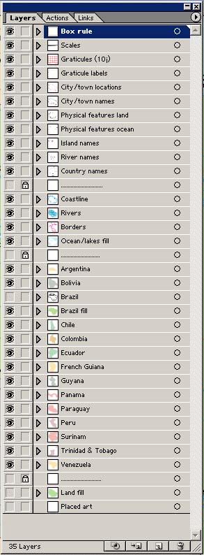 This example of the contents of a typical Frontiers map shows the layers palette for map #214 Northern South America.