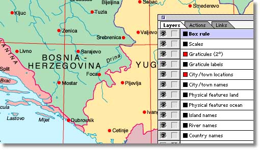 Layers in Illustrator offer a high degree of selectability. The layers palette provide the ability to switch on selective features within each map. Layers are available for: