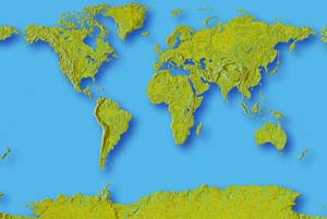 Yellow green continents - bright blue ocean