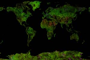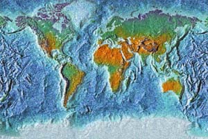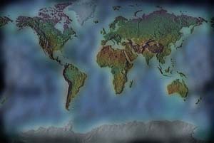 Pale green & brown land - mottled blue ocean